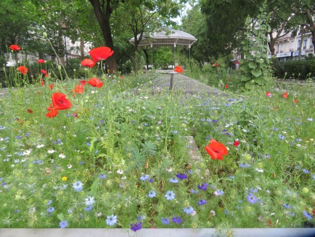 Coquelicots, nigelles et kiosque à musique, dans le jardin aménagé par la paysagiste Jacqueline Osty, au dessus du canal st Martin, 10e.