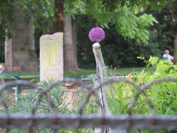 Héron cendré déguisé en grue couronnée, près de la naumachie du parc Monceau, 17e.