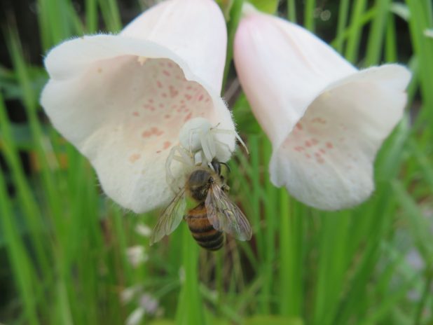 Abeille dans les chélicères d’une araignée thomise, au jardin partagé Ecobox, quartier de la Chapelle, 18e.