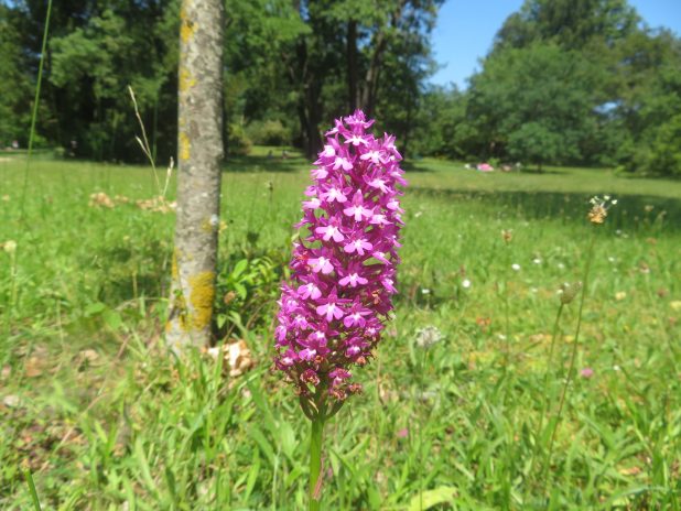 Orchis pyramidal, sur la » plaine d’Arcadie « chère au comte d’Artois, au parc de Bagatelle,16e.