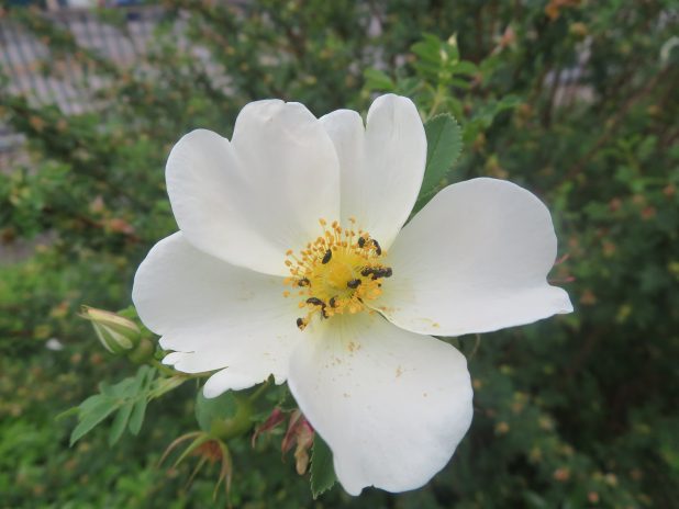 Fleur de rosier à feuille de pimprenelle, au parc Martin Luther King, 17e.