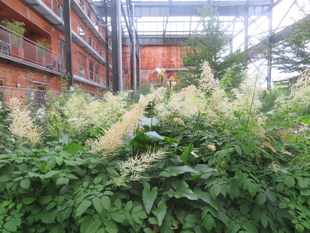 Méli mélo de Zantedeschia aethiopica et d’Aruncus dioicus, au jardin Rosa Luxemburg, dans le quartier de la Chapelle, 18e.