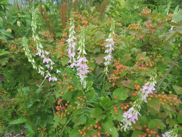 Galega officinal surgissant d’une viorne obier, au parc Martin Luther King, 17e.
