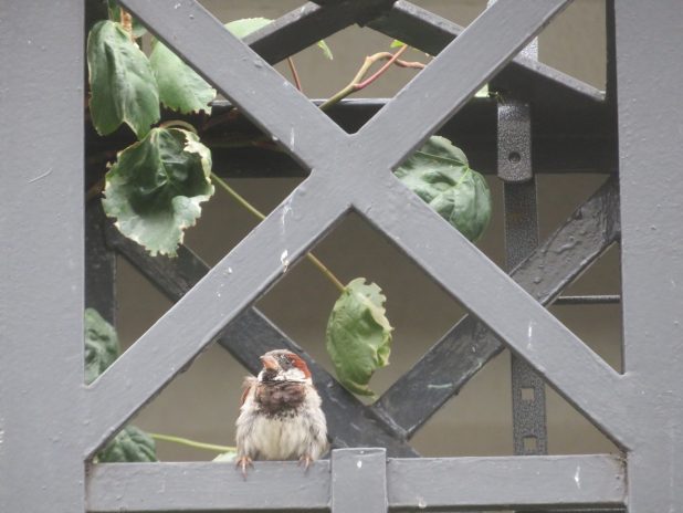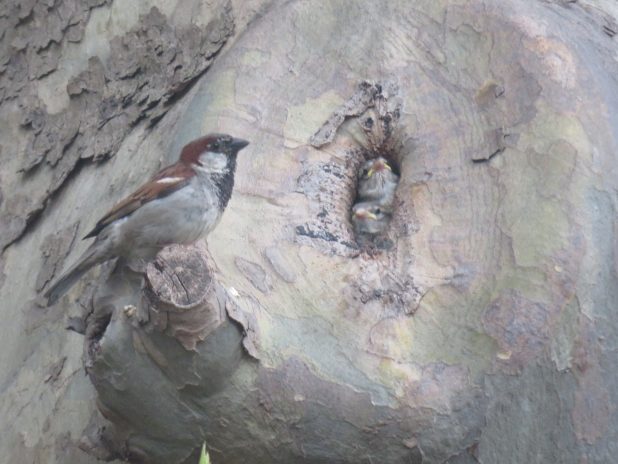 Famille de moineaux dans le square Louise de Marillac, quartier de la Chapelle, 18e.