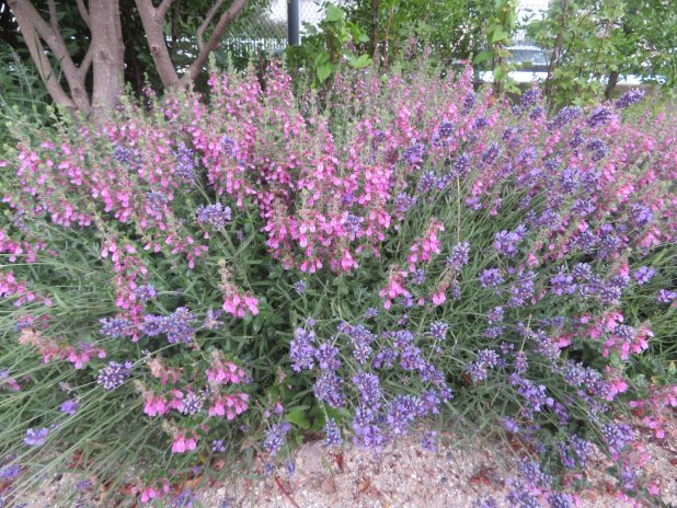 Méli mélo entre une lavande, Lavandula sp, et une germandrée, Teuchrium chamaedrys, au jardin d’Eole, 18e.