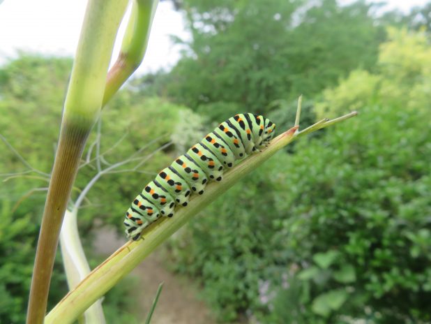 Chenille de machaon sur une de ses plantes hôte, le fenouil, au Parc floral, 12e.