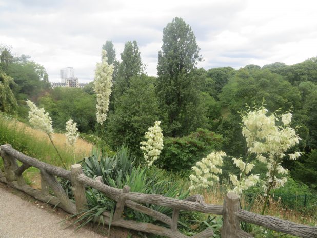 Floraison d’un Yucca filamentosa et balustrade en rusticage, au parc des buttes Chaumont, 19e.