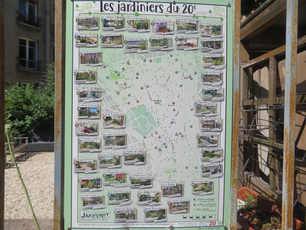 Plan des jardins partagés du 20e, affiché sur la porte du jardin Papilles et papillons, dans le quartier de Ménilmontant, 20e.