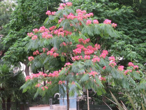 Jeune Albizzia à l’entrée du square de la Madone, quartier de la Chapelle, 18e.