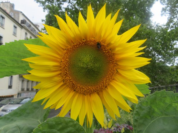Tournesol dans » l’Oasis urbaine « , à proximité du square de Jessaint, à découvrir lors de la balade dans les jardins partagés du 18e.
