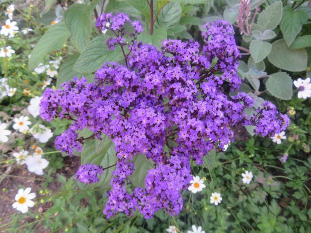 Héliotrope parfumée, dans un massif de plantes annuelles, au parc de Bagatelle, 16e.