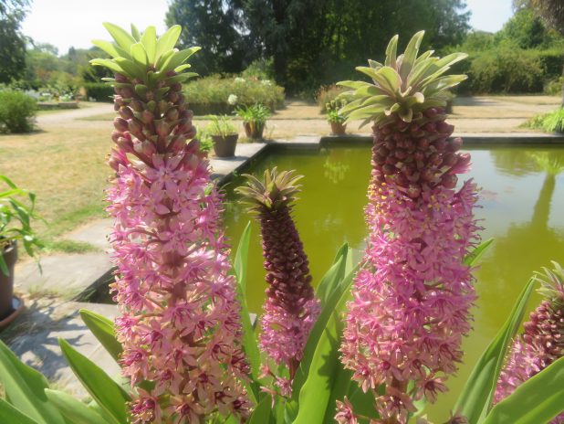 Eucomis comosa ‘ pink gin ‘, en pot près du bassin de l’école du Breuil, 12e.