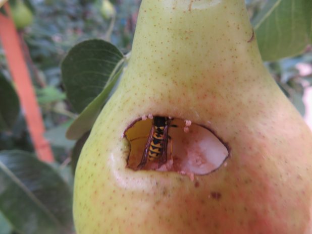 Guêpe se délectant d’une poire dans le jardin Alain Bashung, quartier de la Goutte d’Or, 18e.