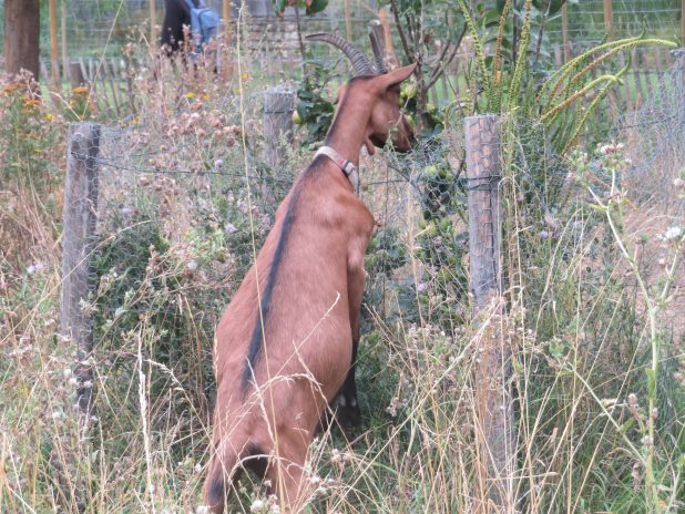 Chèvre se gobergeant de pommes, dans la prairie/verger du jardin d’Eole, 18e.