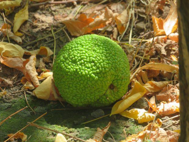 Orange des osages, Maclura pomifera, dans le square Sergent Aurélie Salel, dans le quartier de Ménilmontant, 20e.