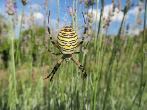 Argiope frelon en embuscade dans une lavande, dans un jardin de l’école du Breuil, 12e.