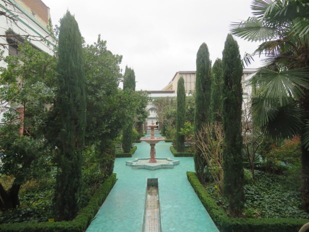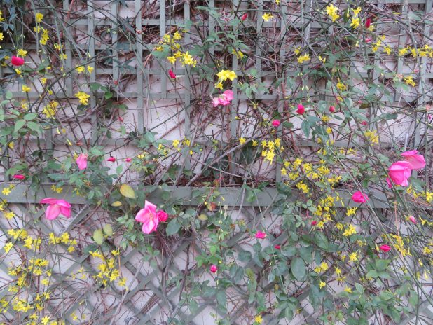 Rose de Chine et jasmin d’hiver dans le jardin Anne Frank, au début de la future balade » passages couverts de l’Est « .