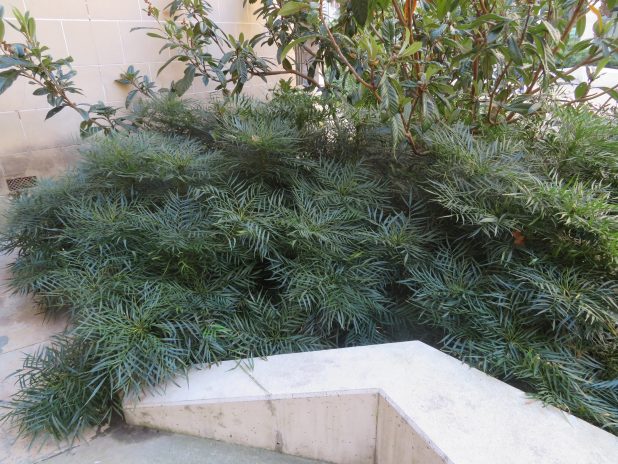 Beau massif de Mahonia eurybracteata à la médiathèque Françoise Sagan, 10e.
