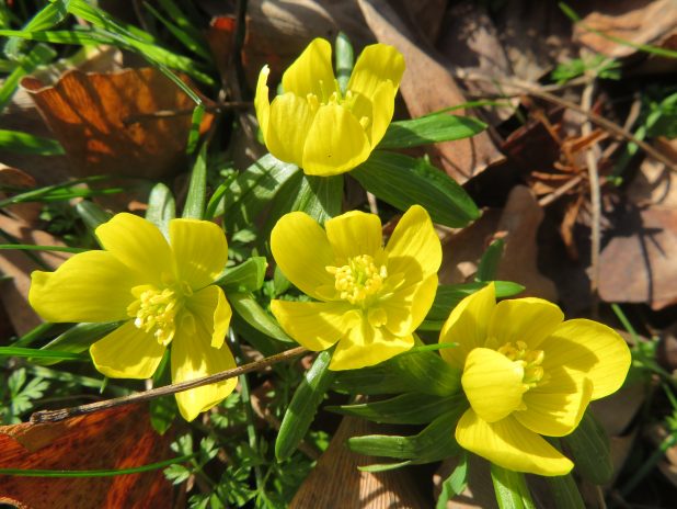 Eranthis hyemalis en fleurs au jardin des serres d’Auteuil, 16e.