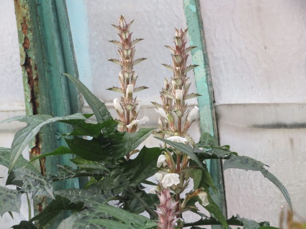 Fleurs d’Acanthus montanus dans une serre du jardin d’Auteuil, 16e.