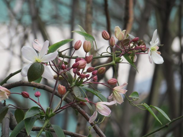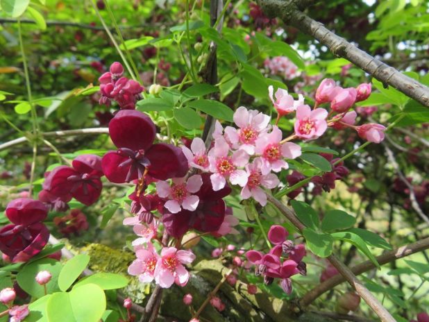 Méli mélo entre Akebia quinata et Prunus padus ‘ coloratus ‘, au parc de Bagatelle, 16e.