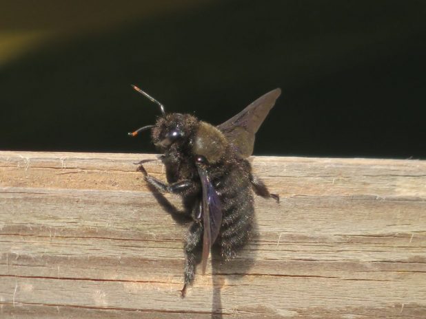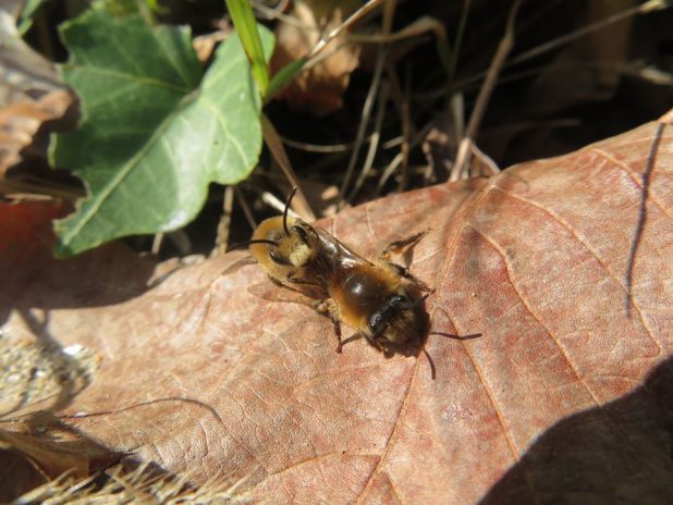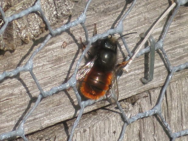 Bain de soleil d’une osmie cornue femelle, sur un hôtel à insectes, au parc des Chanteraines, 92.