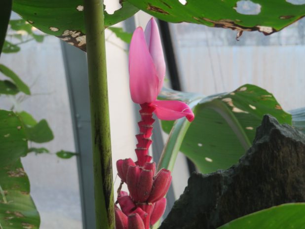 Musa velutina dans la serre contemporaine dédiée à l’Asie, au jardin d’Auteuil, 16e.