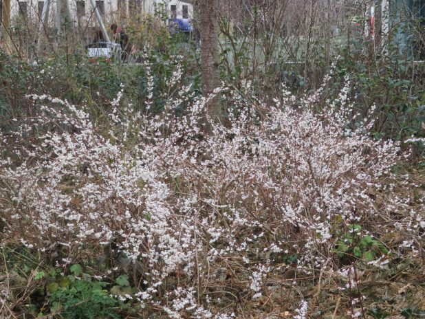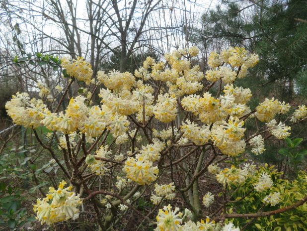 Beau buisson d’Edgeworthia chrysantha, au parc de Bercy, 12e.