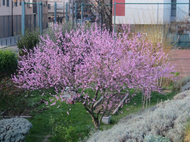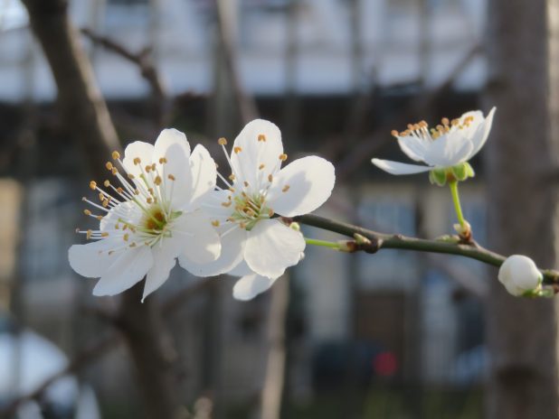 Prunus cerasifera, en fleurs dans le jardin d’Emmaus Solidarité dans le square de Jessaint, sur le parcours de la Promenade urbaine, 10e/18e/19e.