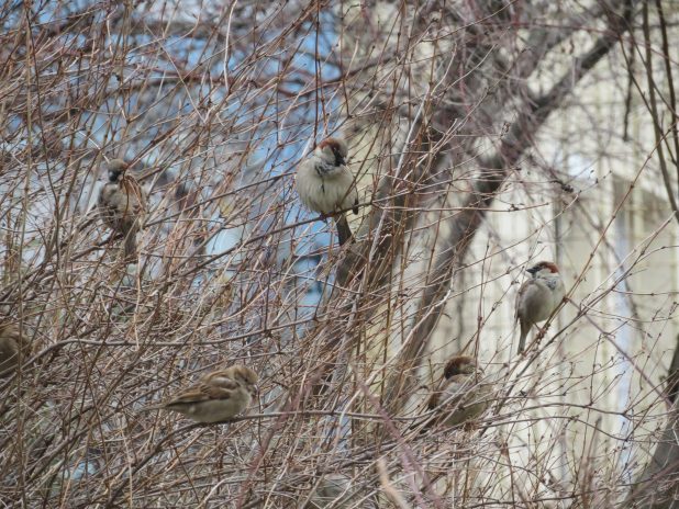 Bain de soleil d’une troupe de moineaux domestiques dans le square Léon, quartier de la Goutte d’Or, 18e.
