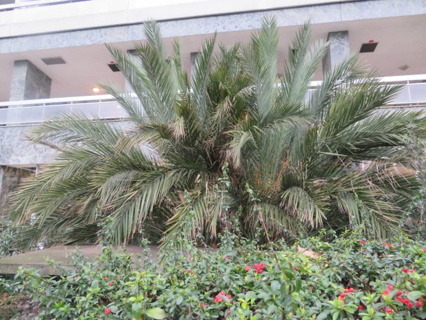 Touffe de palmiers dattiers au pied d’un immeuble entre le bassin de la Villette et l’église st Serge, 19e.