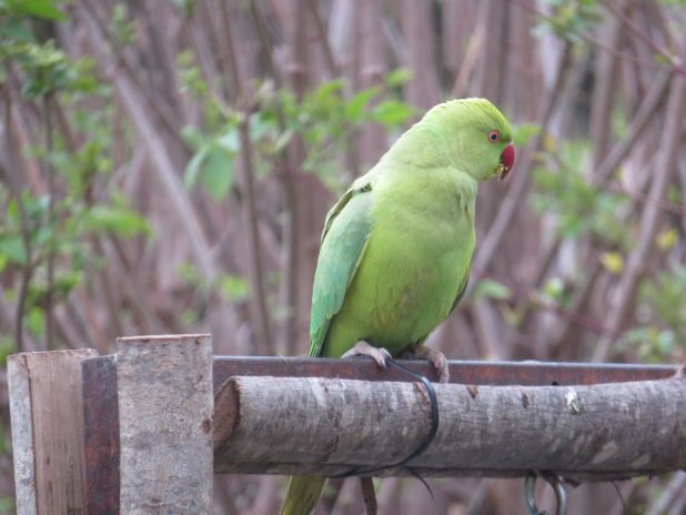 Perruche à collier femelle sur la mangeoire du secteur écologique du jardin des plantes, 5e.