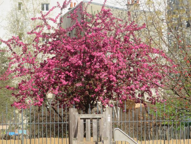 Pommier décoratif dans le square Alain Bashung, quartier de la Goutte d’Or, 18e.