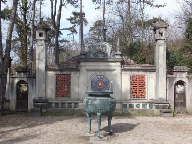 Portique néo indochinois des années 20 et copie d’une des 9 urnes dynastiques exposé au palais de Hué au Vietnam, dans le jardin d’agronomie tropicale René Dumont, 12e.
