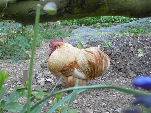 Coq tranquille dans le potager/verger du parc de Bagatelle, 16e.