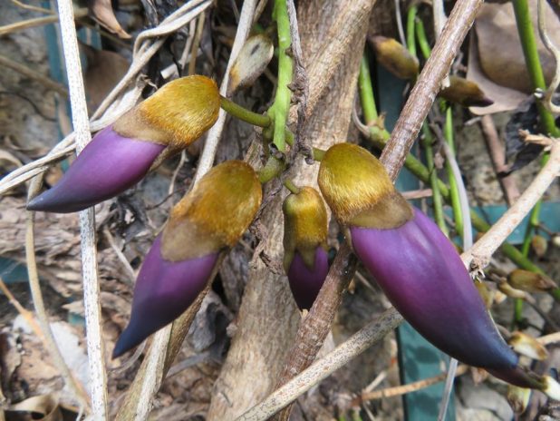 Bouton à fleurs de Mucuna sempervirens, au pied de la balustrade du jardin des serres d’Auteuil, 16e.