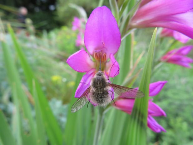 Bombyle butinant un glaïeul d’Italie, près du lac de Varé au parc de Bagatelle, 16e.