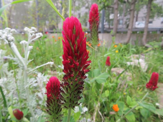 Trèfle incarnat, au jardin partagé » le Trèfle d’Eole « , intégré au parc d’Eole, 18e.