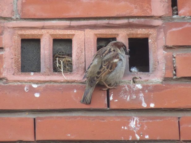 Moineau domestique mâle, à l’entrée de son logis, quartier de la Goutte d’Or, 18e.