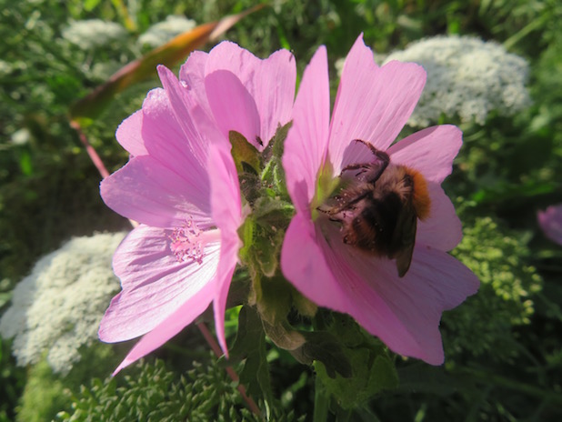 Bourdon des champs, Bombus pascuorum, butinant une mauve musquée, Malva moschata, dans le jardin de Belleville, 20e.
