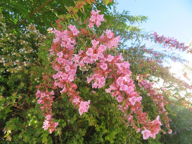 Abelia X grandiflora à fleurs roses au jardin de Belleville, 20e.