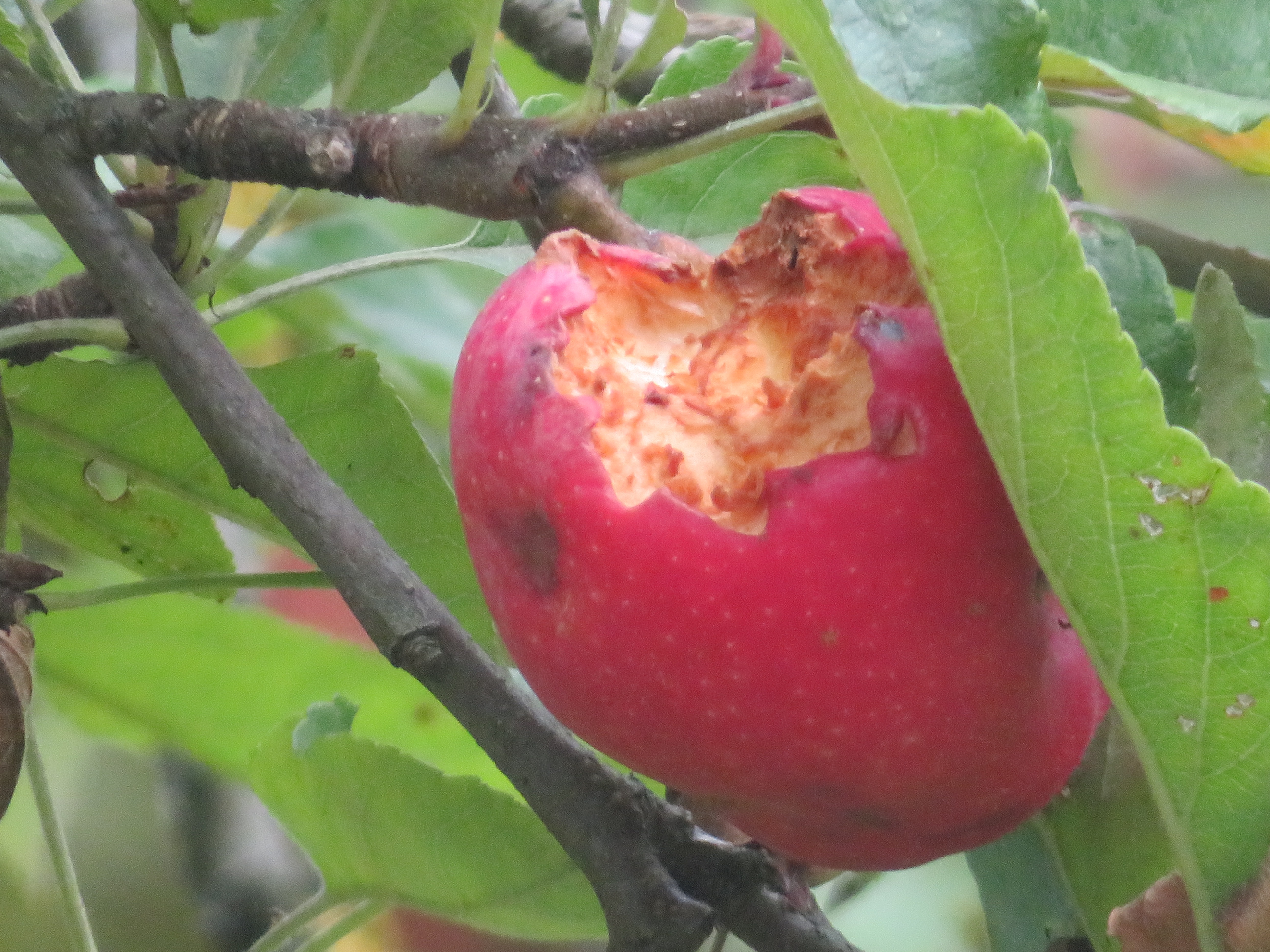 Pomme grignotée par une perruche à collier, à l’arboretum de la Vallée aux Loups, 92.
