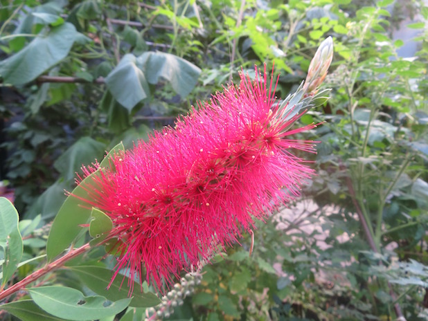 Callistemon en fleurs au jardin partagé de l’Univert, quartier de la Goutte d’Or, 18e.