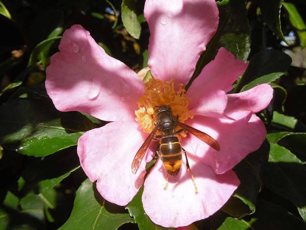Frelon asiatique butinant un Camélia sasanqua à l‘arboretum de la Vallée aux Loups, 92.