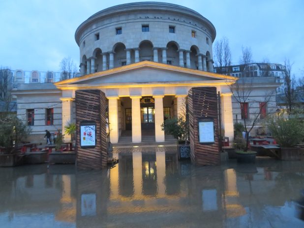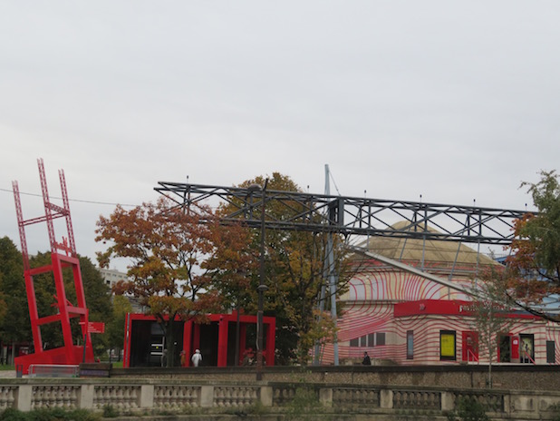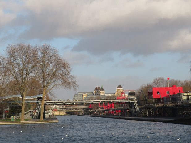 Entrée du parc de la Villette depuis le bord du canal st Denis, 19e.