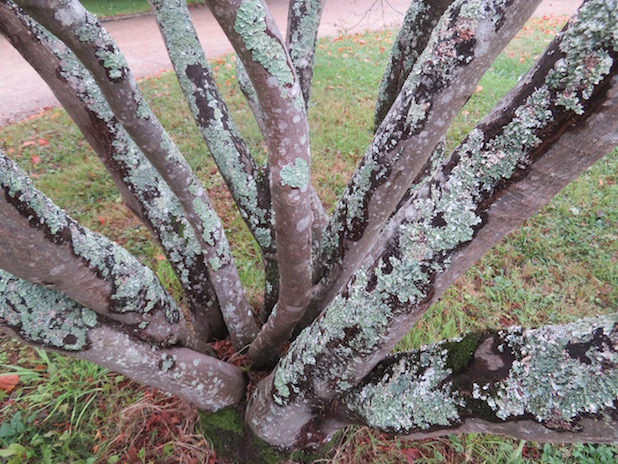 Lichen sur tronc d’érable du Japon à l’arboretum de la Vallée aux Loups, 92.