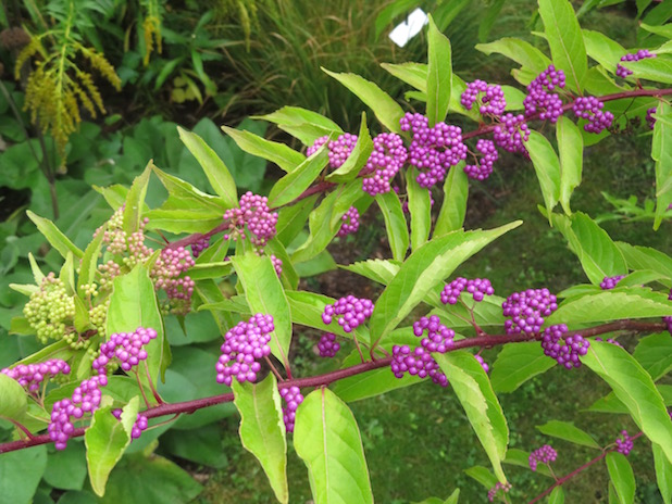 Fruits sur branches de Callicarpa dichotoma, dans un jardin de l‘école du Breuil, 12e.