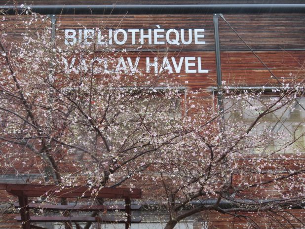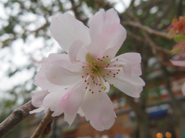 Premières fleurs sur un Prunus subhirtella ‘ autumnalis ‘, place Nathalie Sarraute, quartier de la Chapelle, 18e.