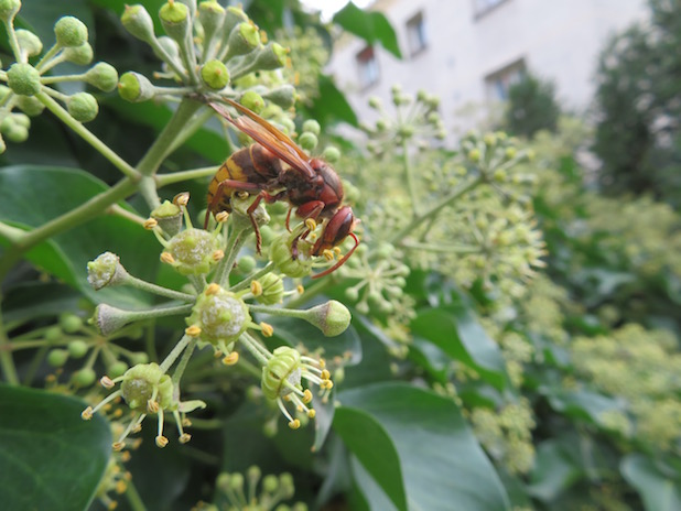 Frelon européen butinant un lierre sur la coulée verte René Dumont, 12e.