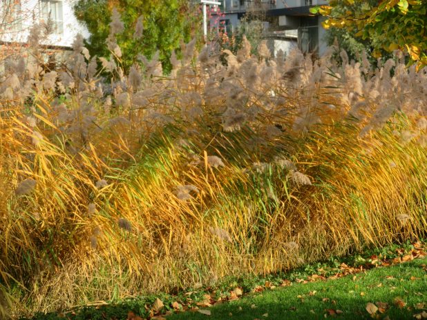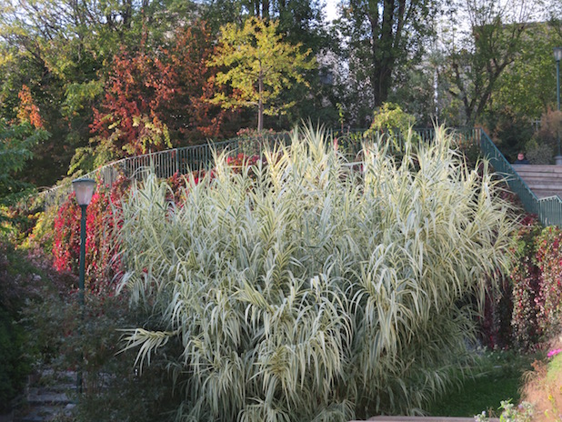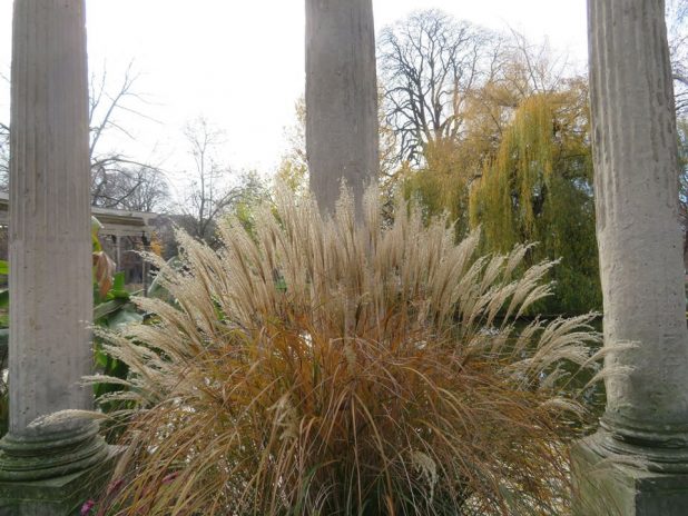 Belle touffe de Miscanthus sinensis près de la naumachie du parc Monceau, 17e.
